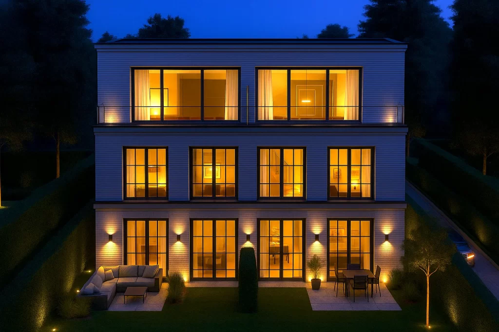 “Mit repräsentativer Fassade, elegantem Entrée und stimmungsvoller Lichtinszenierung überzeugt dieses Projekt durch herausragendes Design. Großzügige Terrassen und ein eigener Garten bieten viel Raum zum Entspannen, während die ideale Südausrichtung sonnige Stunden garantiert.“